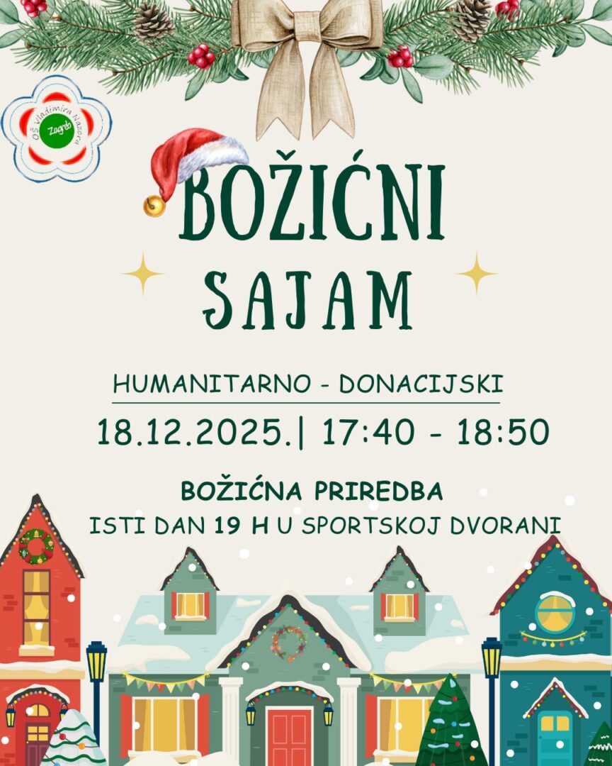 Pozivamo sve učenike, roditelje i prijatelje škole na humanitarno-donacijski Božićni sajam koji će se održati 18. prosinca 2025. godine od 17:40 do 18:50 sati u prostorima škole.
