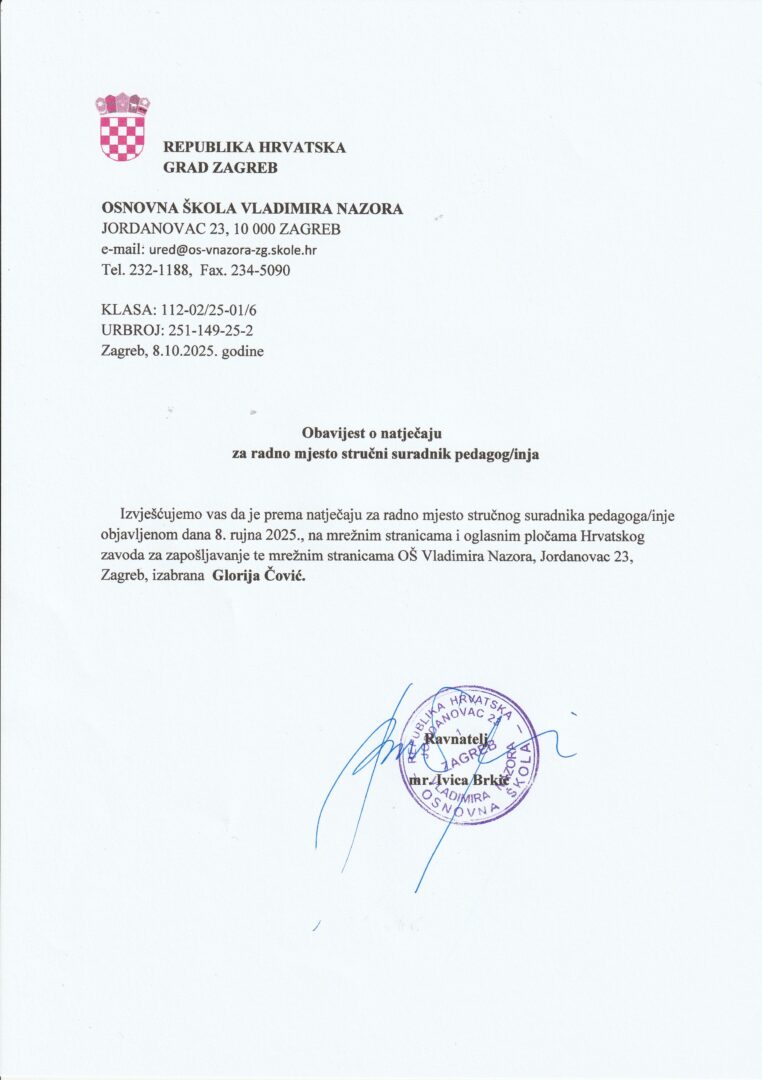 8.10.2025. Obavijest o natječaju za radno mjesto stručni suradnik pedagog-inja