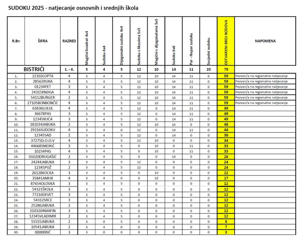 S ponosom objavljujemo rezultate školske razine Sudoku natjecanja, održanog 24.10.2025. Natjecanje je okupilo brojne zaljubljenike u logičke zagonetke, a atmosfera je bila ispunjena uzbuđenjem, koncentracijom i veseljem.